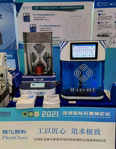 2021年4月8日,理化聯科(北京)儀器科技有限公司(PHYSICHEM INSTRUMENT CO. LTD.)在深圳國際石墨烯論壇展出其全新的全自動比表面積及孔徑分析儀iPore 400,全自動智能脫氣單元iBox026。